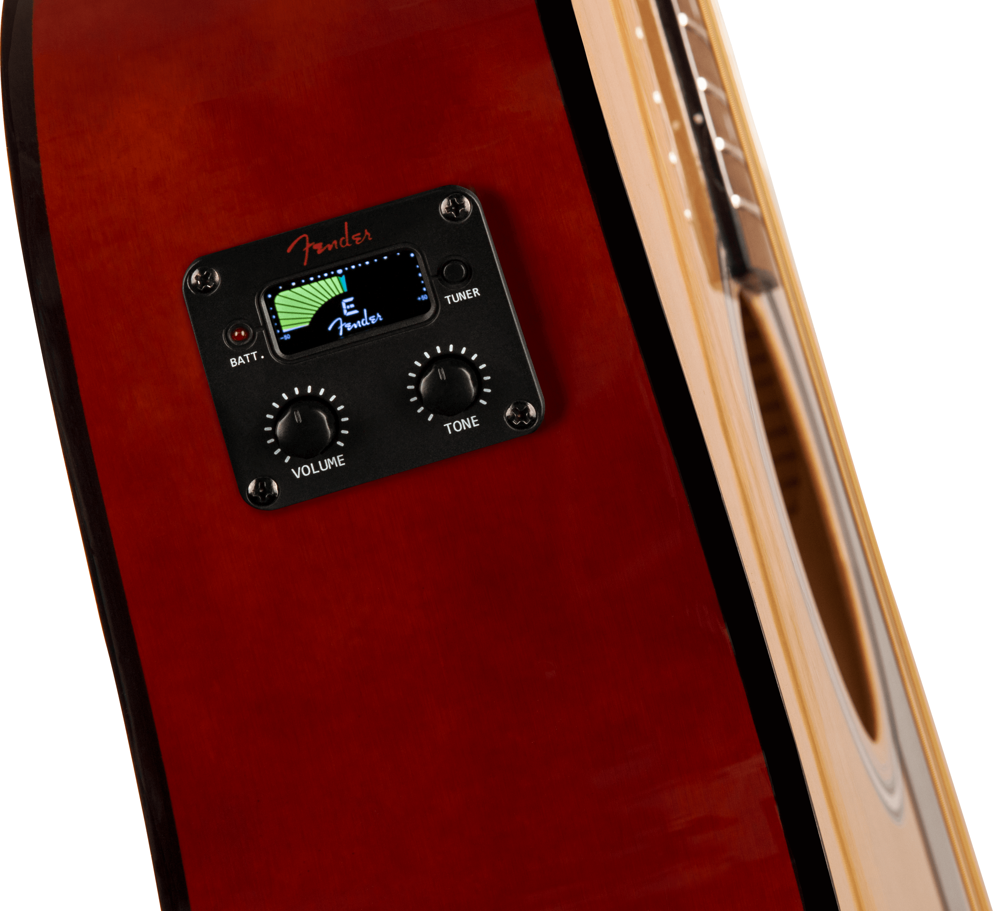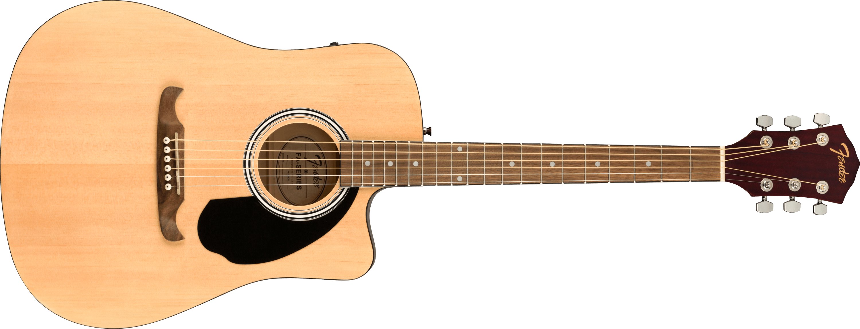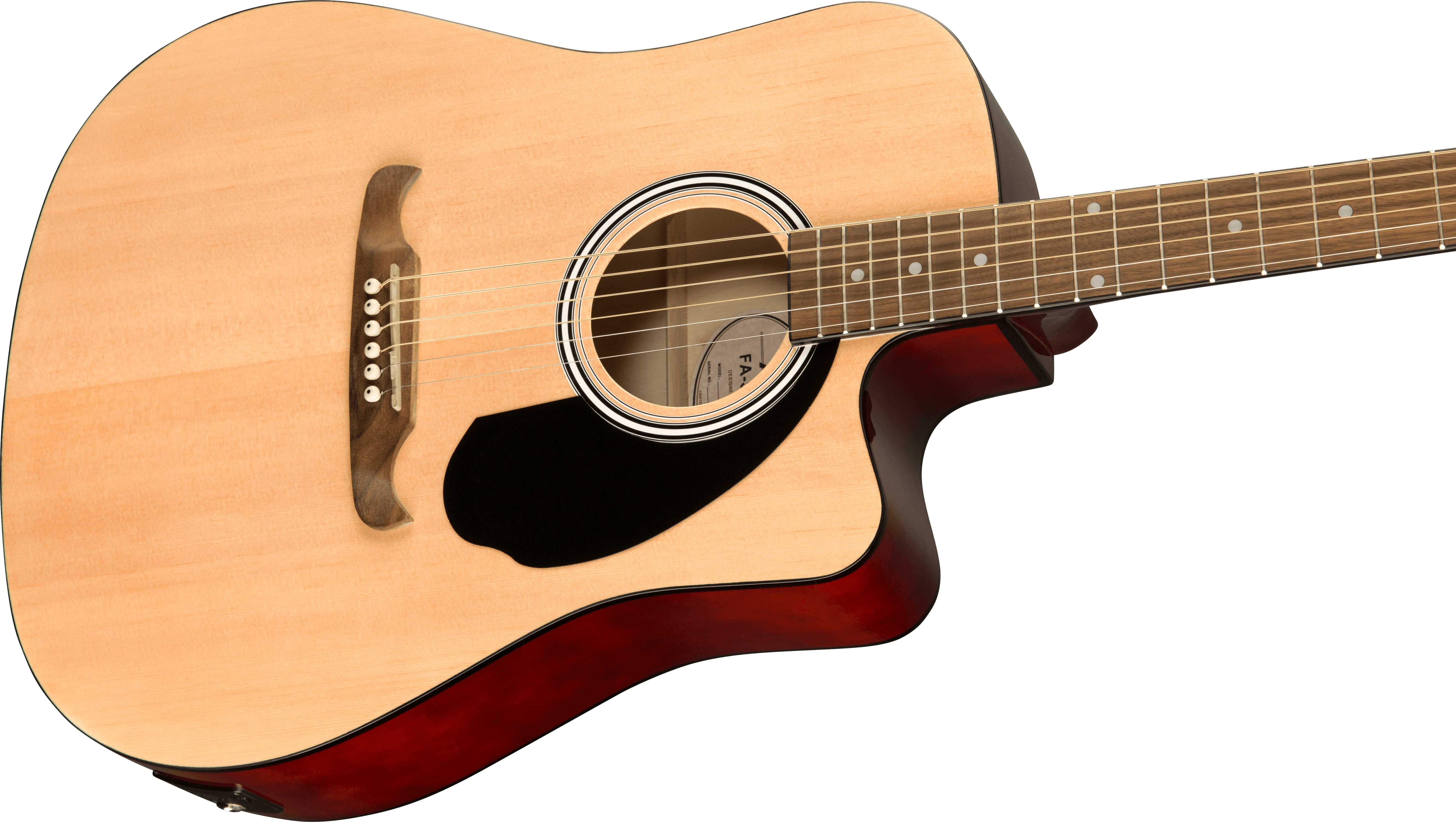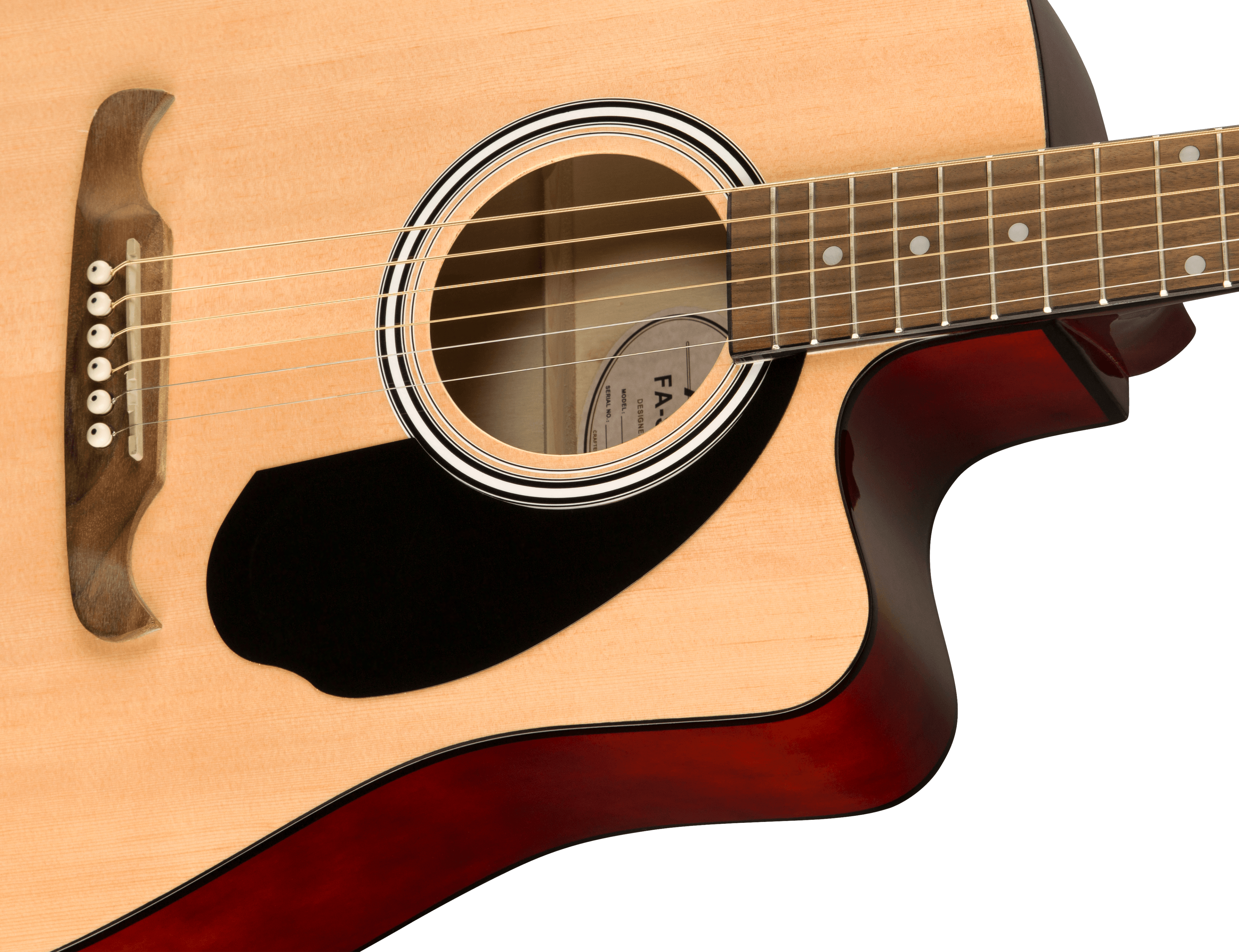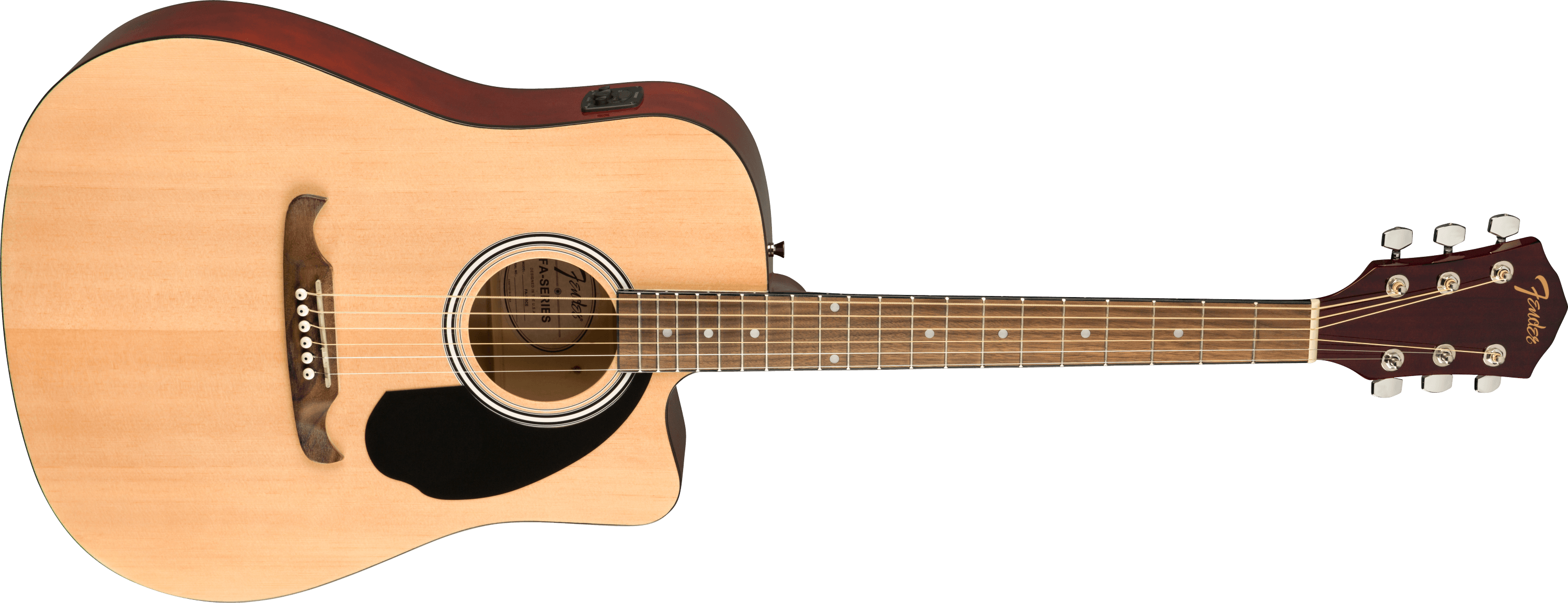 The single-cutaway FA-125CE combines Fender tone and style with our FE-A2 electronics for a guitar that was made to take the stage. Quality laminate construction with a modern Fender 3+3 headstock and Viking bridge create a great-sounding instrument that’s easy to play. Beginners and developing players will appreciate the nato neck that gives the guitar a lively tone and smooth, easy playing feel.