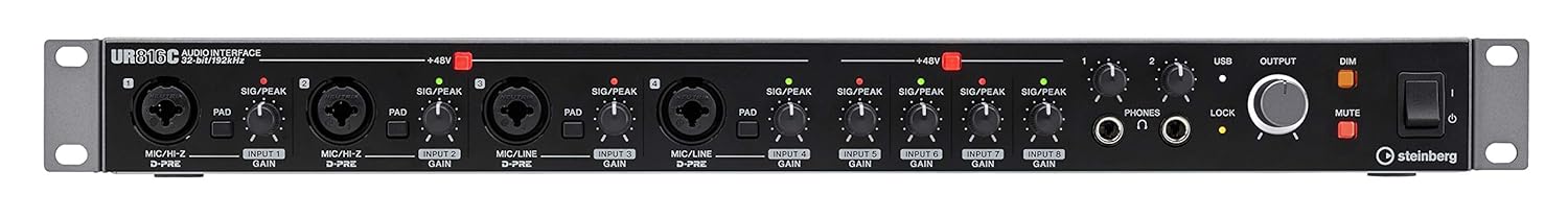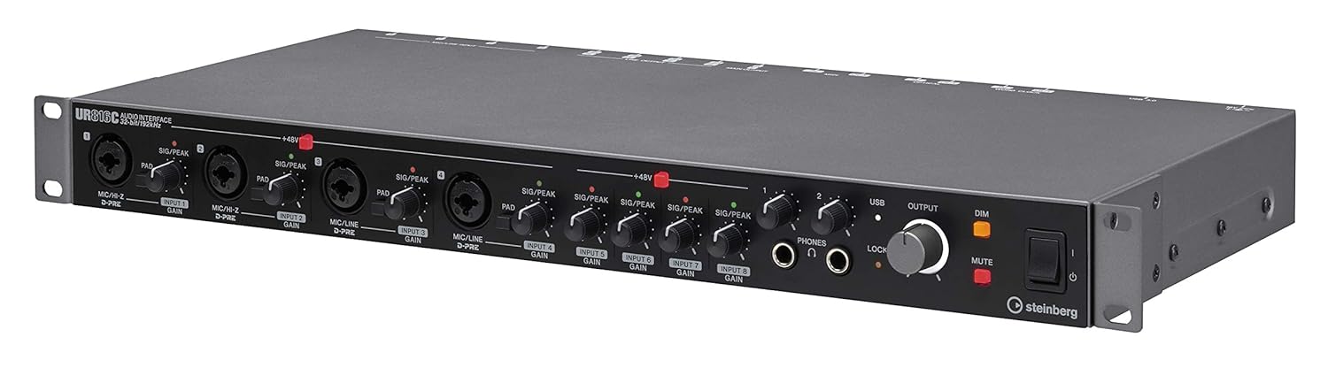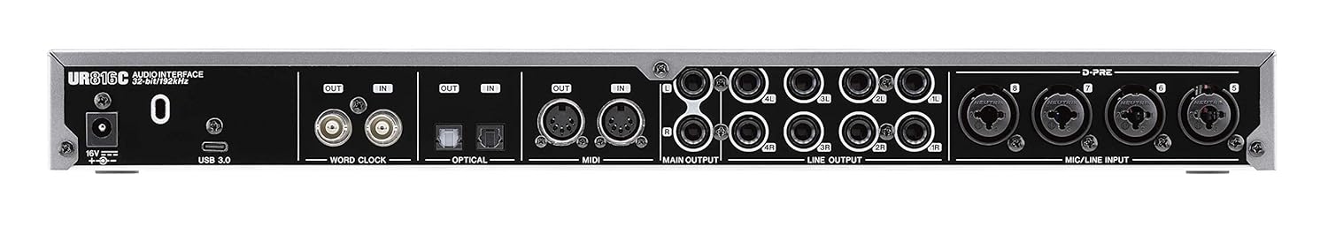The UR816C is the audio interface that forms the heart of your studio. With stunning Class-A D-PRE microphone preamps and 32-bit/192 kHz recording quality, it delivers professional results in every sense. The comprehensive set of mic inputs allows you to record even a full drum set and, with the HI-Z inputs, electric guitars can be captured cleanly and perfectly monitored with zero latency, thanks to the included DSP-based guitar amp simulations. The MIDI connections allow you to use a variety of controllers. The digital connections let you expand your studio by adding converters and word clock with the latest jitter reduction technology makes sure other professional audio equipment will be perfectly synchronized. Dim and Mute function add further studio-grade functionality… and all this can be used with any DAW.